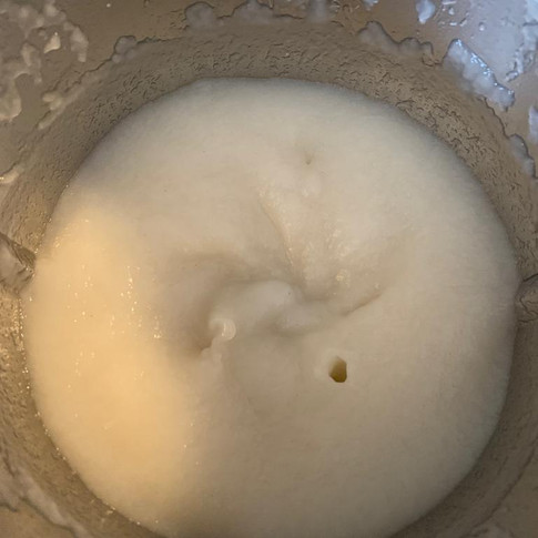 1) Suspend the water and citrus fibre under a high shear for 2 minutes to create a thick suspension. This is what we will be using to reduce the fat in the recipe. Using this suspension gives a fat like texture while also enabling us to not use starch, which allows more flavour to come through as starch is well known to block flavour from our taste buds.